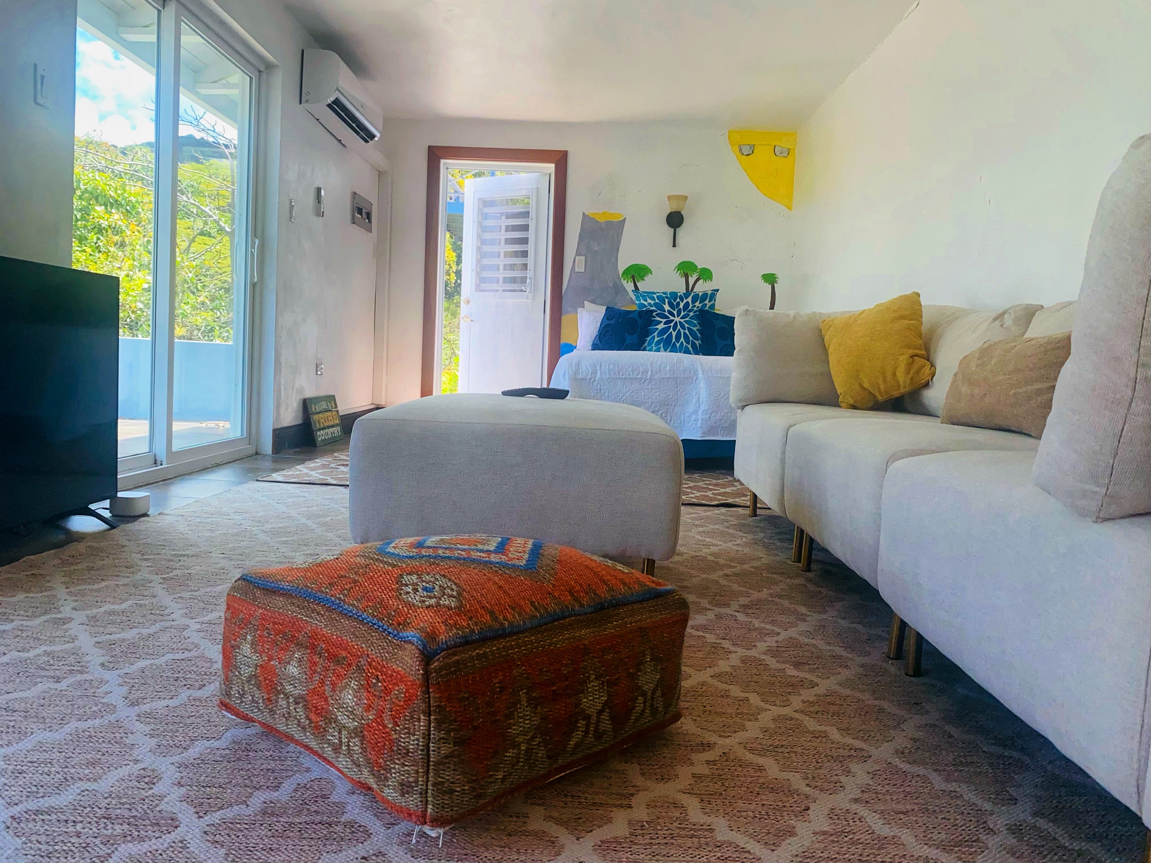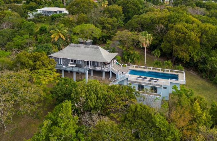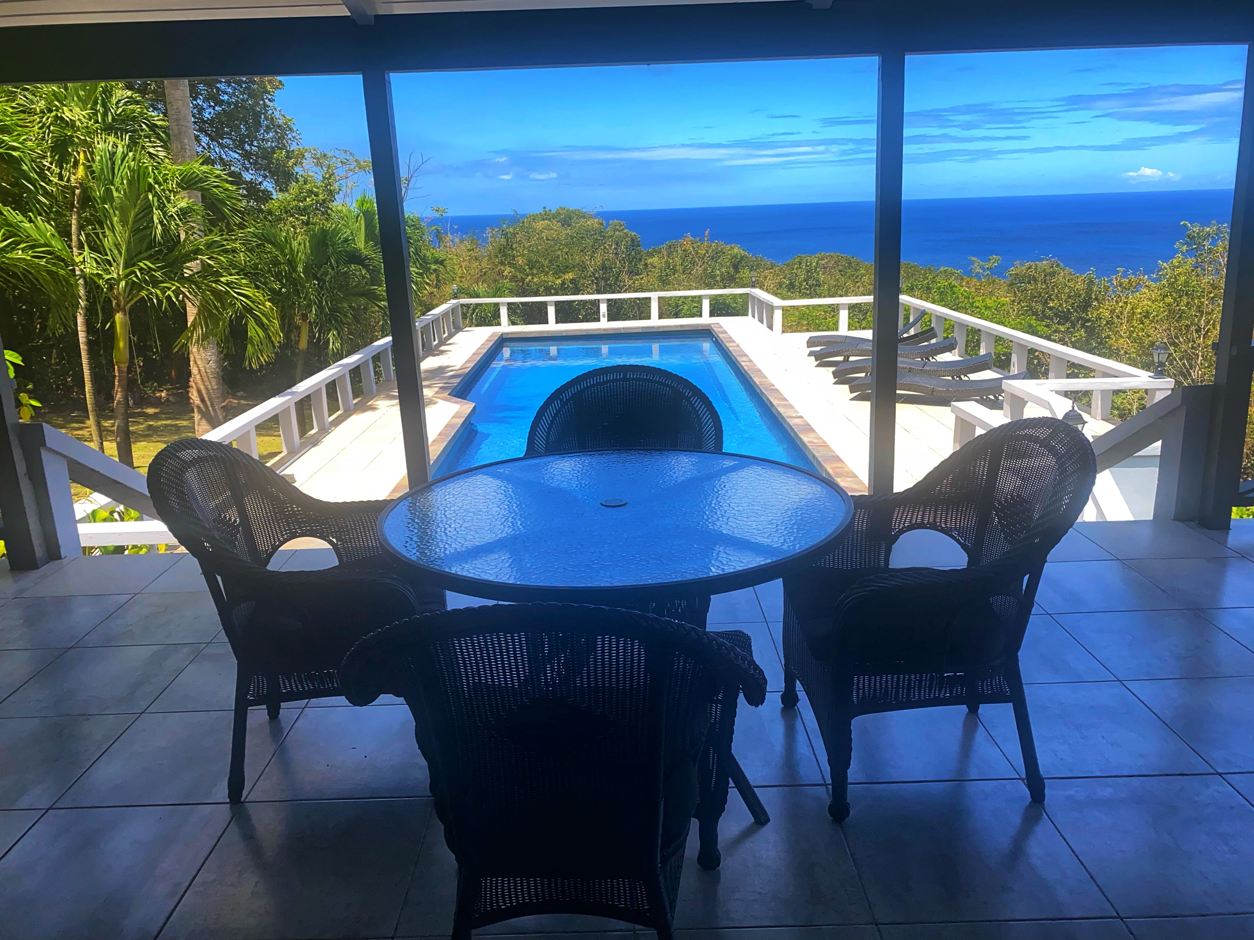 Wing Song is a stunning home with breathtaking views of the sea and mountains. The house has three bedrooms and bathrooms, two of which are on the main level, and one on the lower level.